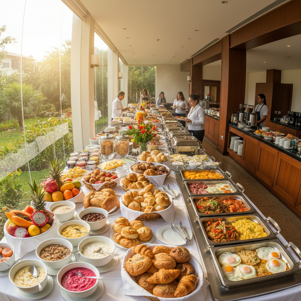 Buffet peruano y continental cada mañana. Frutas frescas, jugos naturales y platos calientes.